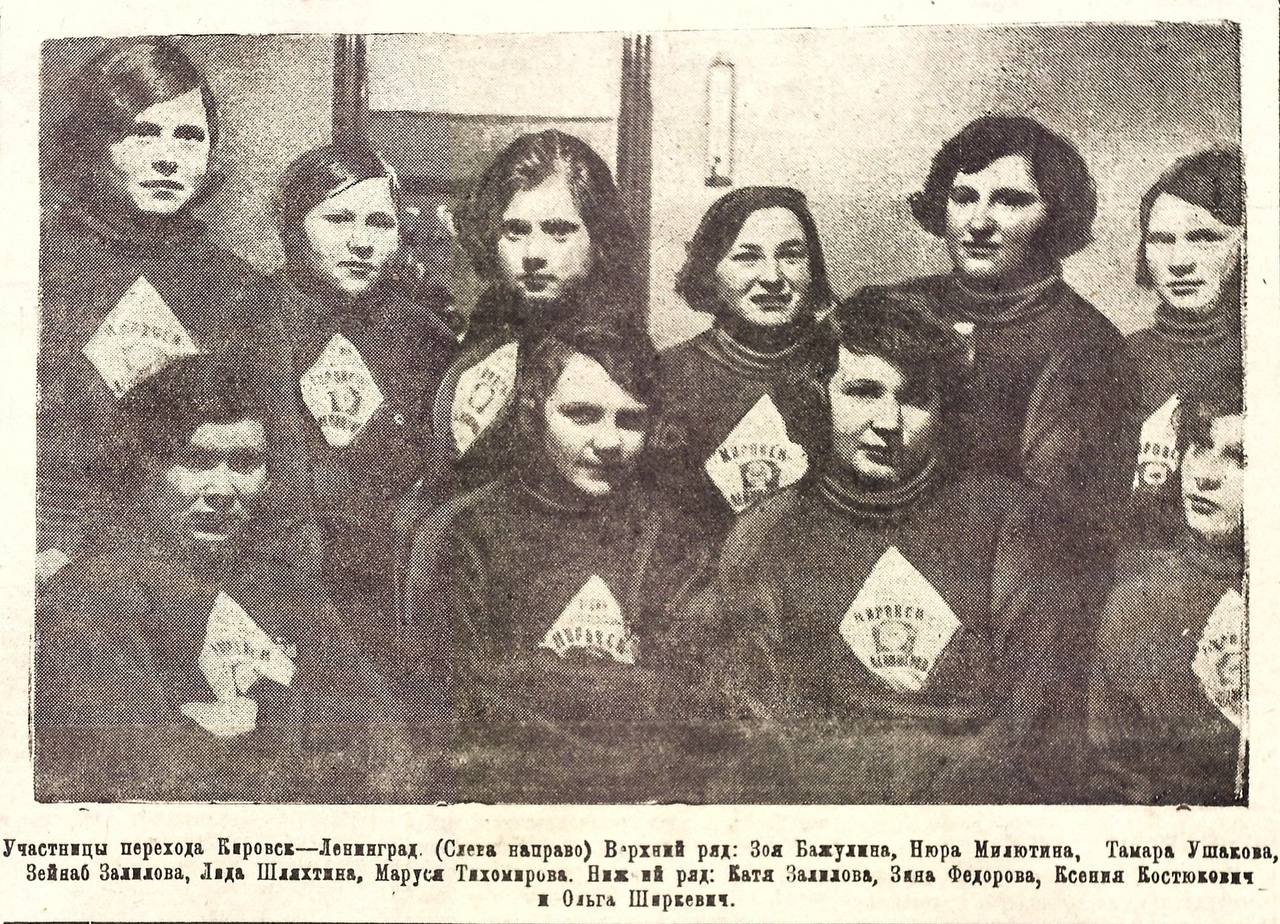В октябре 1935 года десять девушек отправились пешком из Кировска в Ленинград. Как писали тогда в газете «Кировский рабочий», этот переход должен был продемонстрировать выносливость и стойкость молодежи, готовность в любую минуту по зову партии и правительства встать на защиту советских рубежей. Помимо этого, участницы вели просветительскую работу – в населенных пунктах, где останавливались для отдыха, рассказывали жителям о Кировске и его промышленности. Маршрут пролегал вдоль железной дороги, так как на станциях обеспечить участниц ночлегом и горячей едой было легче. У каждой девушки в рюкзаке находился двухдневный запас питания, а в термосах какао. Всем участницам перехода выдали сшитые по специальному заказу обувь и одежду. Утверждена была форма: лыжная шапочка, свитер, непромокаемая тужурка, шерстяные брюки-гольф и высокие кожаные ботинки, плюс летный шлем с очками, на руках шоферские краги. На все это из средств финотдела треста «Апатит» в распоряжение комиссии по проведению похода было выделено 16.000 рублей. Кандидатуры участниц обсуждались на комсомольских собраниях по месту работы, все прошли строгий медицинский отбор. Целый месяц проводились тренировки на 25, 40 и 100 км, походы Кировск-Апатиты и Кировск-Умбозеро.