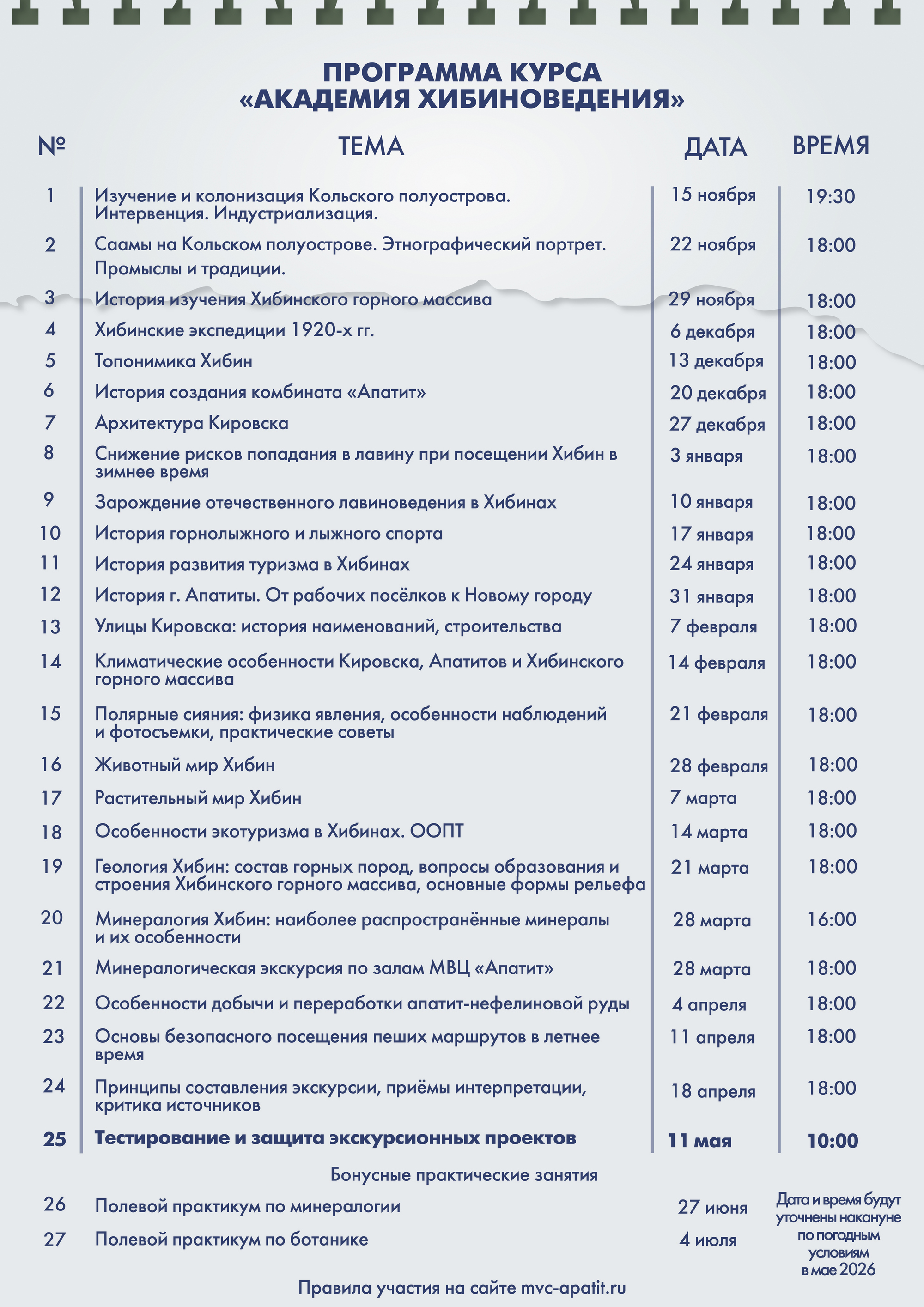 С 15 ноября по 11 мая в МВЦ «Апатит» будет проходить очный курс «Академия Хибиноведения». Это цикл очных лекций, который будет полезен для будущих и практикующих гидов-экскурсоводов, а также для всех заинтересованных лиц. Лекции будут проходить каждую субботу в МВЦ "Апатит".