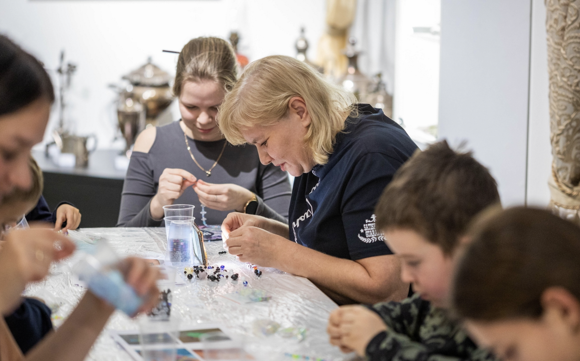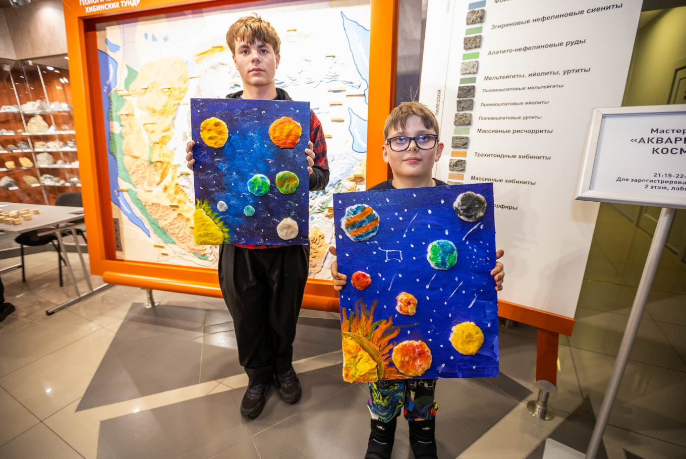 Любители мастер-классов решали главный вопрос этой «ночи»: что же выбрать? Ведь интересно все! Своими руками они создали монохромные картины, выкладывая гальку на холсте, а также цветочные композиции из камешков. Кому-то приглянулась возможность изготовить необычные космические картины с собственной «солнечной системой». Любители бижутерии сделали уникальные украшения с использованием люминесцирующих бусин и декоративных элементов, а также брелоки с оптической иллюзией. Не забыто было старинное искусство оригами – здесь ребята и взрослые собирали фигуру диаманта из бумаги. Сложить объемный кристалл кому-то удалось легко, другим пришлось повозиться, но в итоге получилось у всех! И, конечно, ажиотаж вызвала возможность соорудить собственный калейдоскоп, причем геологический, ведь цветные стеклышки в нем заменили настоящие минералы, подготовленные геологом МВЦ «Апатит» Александром Николаевым: желтая сера, сияющий апатит, оранжевый микроклин, прозрачный кальцит, золотой астрофиллит, розовый родонит, охристый сфен, бело-голубой кианит, красный виллиомит, зеленый амазонит. Во время работы ученики узнали, когда и как появился первый калейдоскоп, какой из них самый дорогой и самый большой в мире.