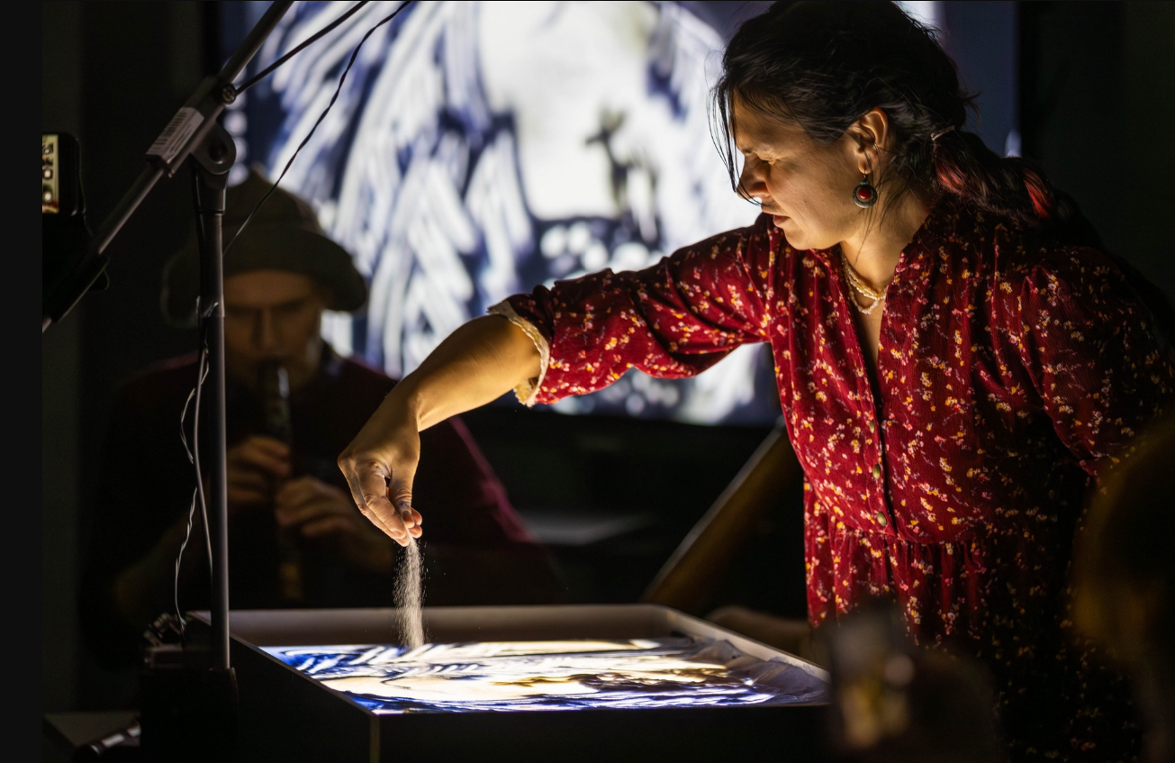 Погрузиться в медитативное, расслабленное состояние помогала йога в башне музея, а также песочная саамская сказка в исполнении Людмилы Семеновой. С каждым движением рук перед зрителями разворачивались удивительные картины: возникали и исчезали образы, оживали сюжеты о связи человека и природы. А помогала создать настроение волшебства этническая музыка группы «Атма».