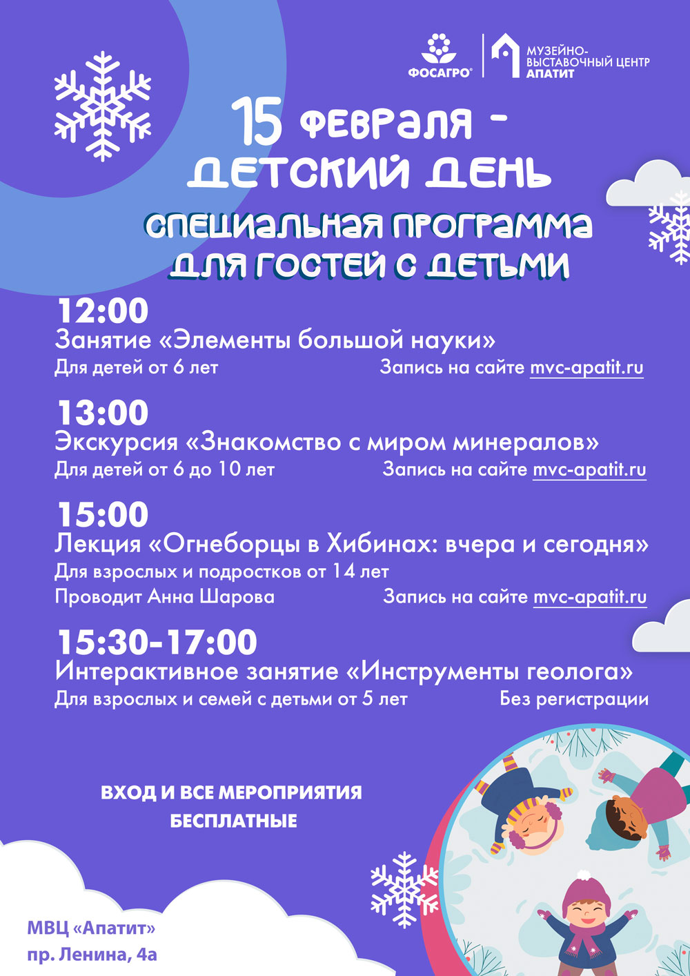 15 февраля ждем семьи на Детский день, на котором дети откроют «Элементы большой науки», познакомятся с миром минералов, с профессией геолога и научатся пользоваться основными инструментами, необходимыми для экспедиции. Пока юные исследователи будут совершать свои открытия, для родителей пройдет лекция об истории одной из старейших служб Кировска — пожарной охраны.